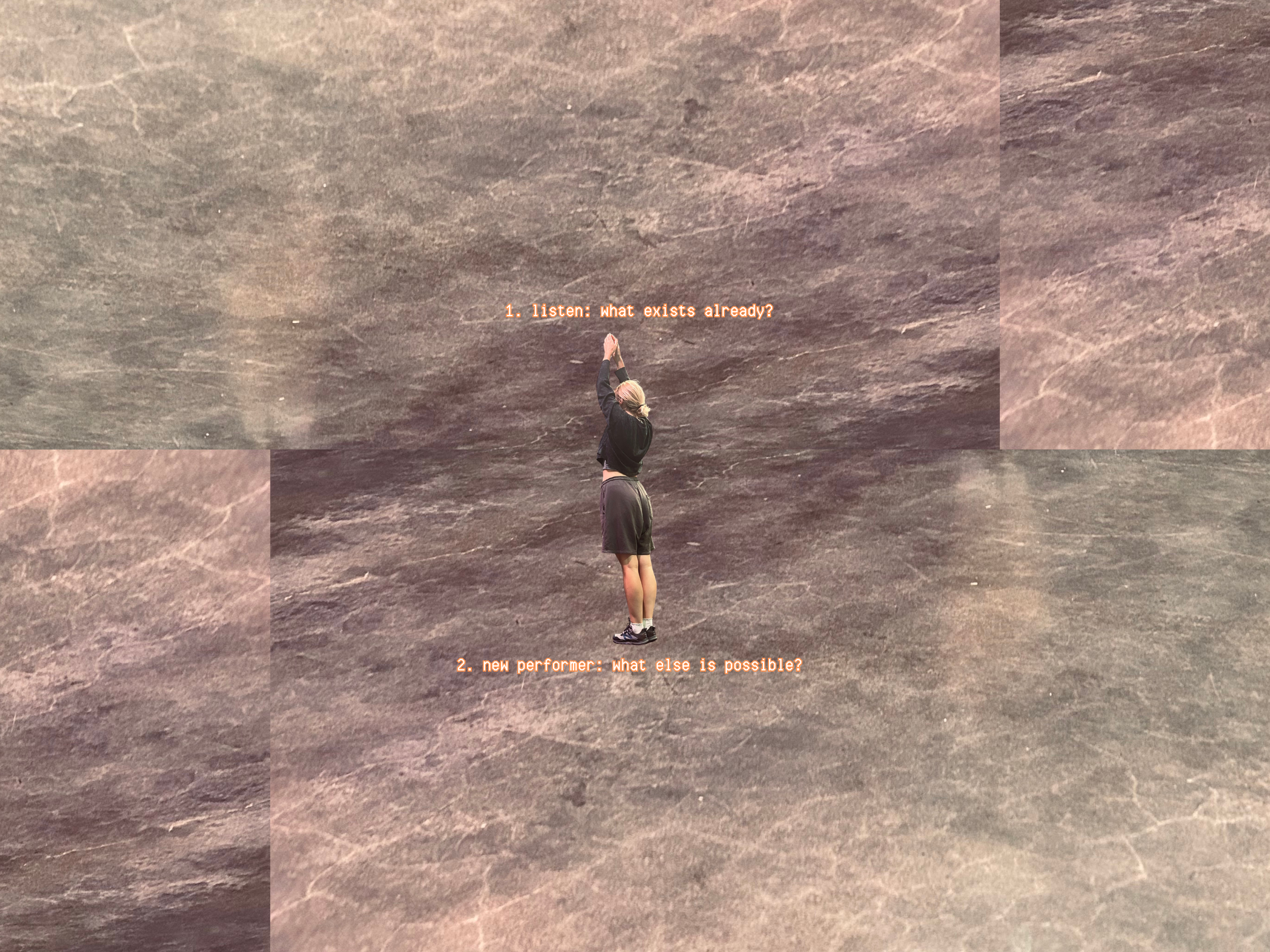 Over the years, I’ve added new scores and structures layering in different themes, emphasizing the role of witnesses, space, performativity, and collaboration / group scores. I’ve often taught or done a Feldenkrais Awareness Through Movement lesson before a Clearing score, as a preparatory experience of deep listening and feeling. Clearing practice today is about being with what is, as a person and as a performer. Being honest, real, and accepting of what has shaped you, what you like, how you move. Meeting yourself in ease. And then, your task is to figure out what else you can make possible. The practice requires the performer to create and imagine from themself (to start), so one must become conscious of the materials and process of improvising. We are often conditioned to expect a more definite external prompt and so starting your first clearing score might elicit a feeling of doubt or confusion. This is part of it, in my experience, too! The feeling of not doing it correctly, I think, is necessary to the practice. The performer of the score must experience trial and error. They must risk failure every time. To go from one place to another, like the score asks one to do, there will be resistance, learning, change. Over time, our consciousness of the learning process becomes more crisp and our ability to make intuitive choices becomes easier. In public classes, workshops, and working groups, I’ve seen these scores support the emergence of a new clarity to a performer’s artistic voice, direction, and a new range of performative personas. Working in groups and witnessing each other also lends itself to community, acceptance, caring, and over all emotional well-being.